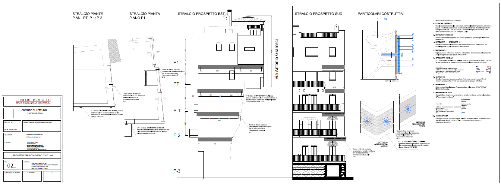 Sistema per evitare l'innesco di possibili cinematismi fuori dal piano. Preparazione del supporto con eliminazione delle parti incoerenti, stilatura dei giunti, realizzazione superficie piana con Planitop HDM, posa in opera delle fasce in tessuto di carbonio MapeWrap C uniassiale 600gr.