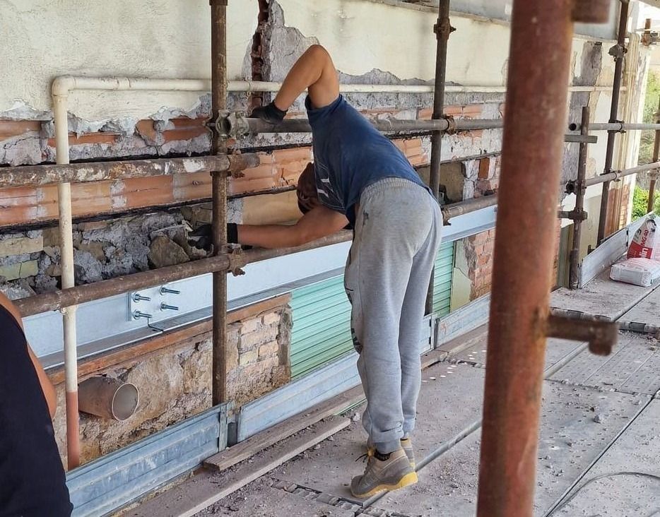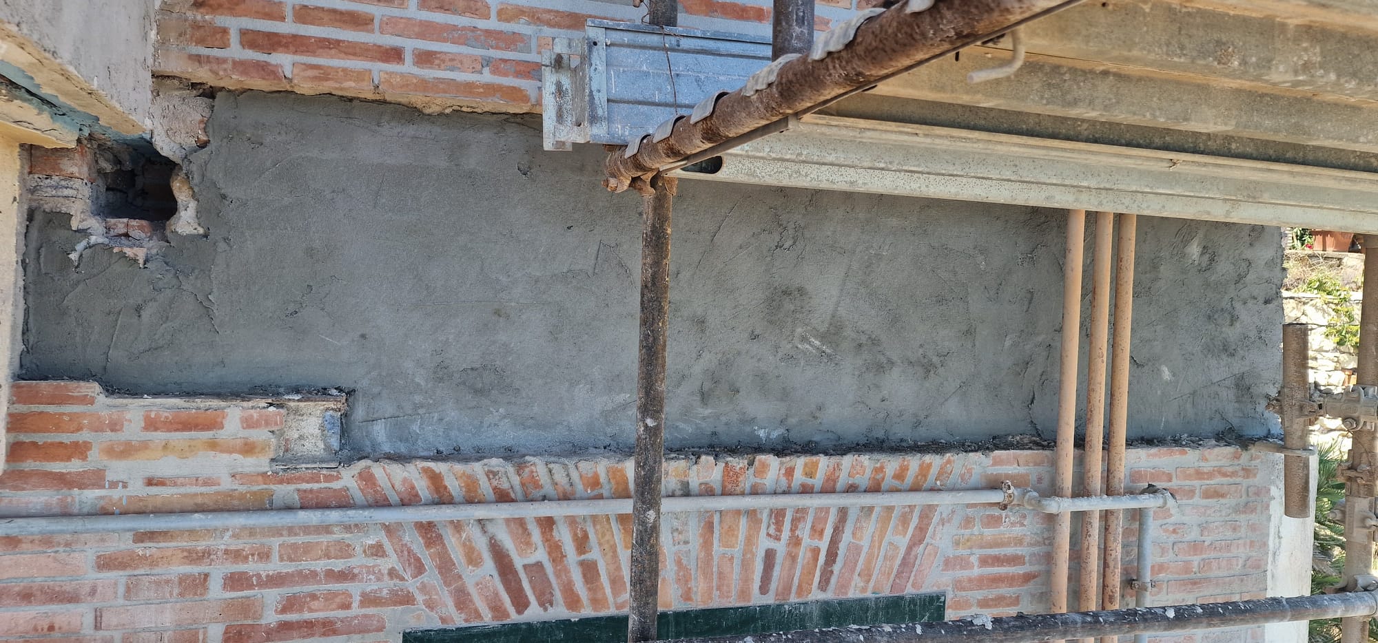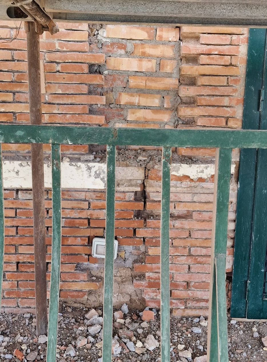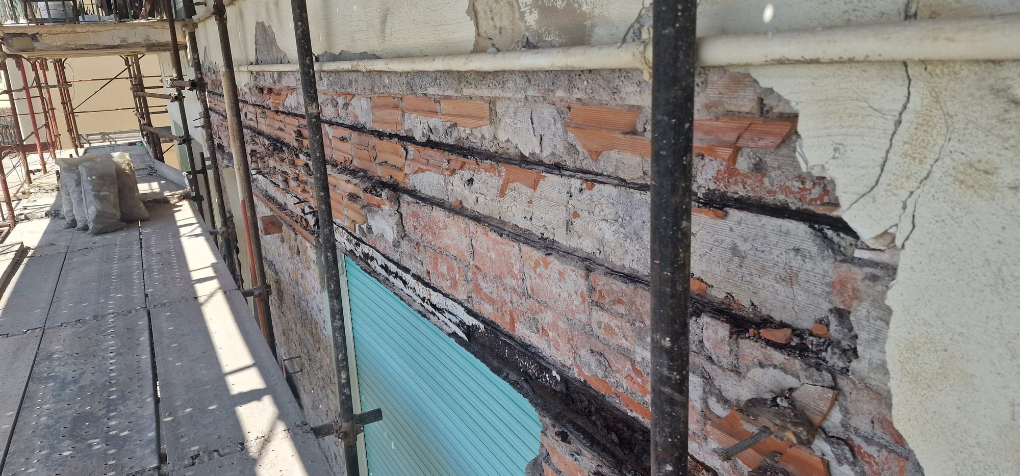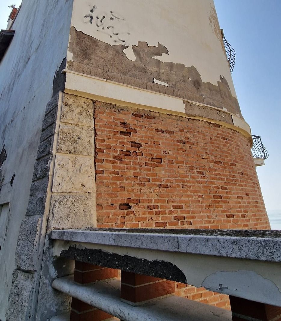La cortina a faccia vista risultava degradata in più zone con pericolo di caduta di materiale dall'alto